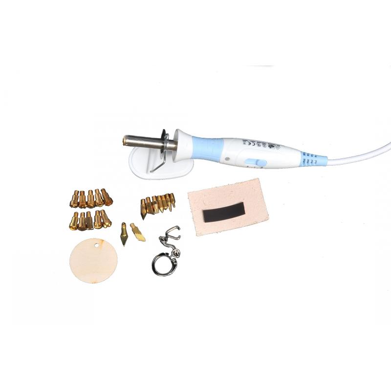 The Pyromaster brings this ancient craft into the 21st century with its revolutionary precision control tips. The tool should be held like a pen for extra control and details. Heats up to temperature in about 5 minutes. Supplied with a stand, 10 branding tips, 9 different drawing/shading tips, a wooden keyring and a leather fridge magnet.